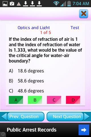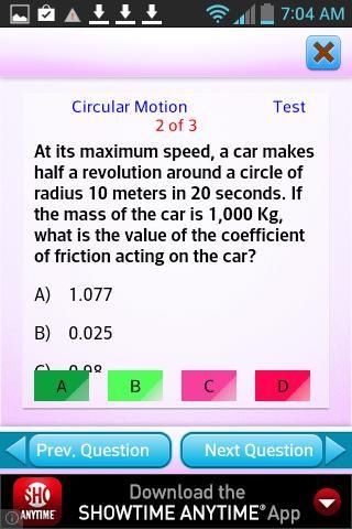 В режиме «Тест», приложение не показывает контекстного или концепт видео, чтобы помочь вам. Вместо этого, вы используете свои полученных знаний из приложения и пытаться вопросов множественного выбора. Опять же, приложение предложит вам подробный ответ объяснения в случае, если вы ответить неправильно. Это доказанный процесс снова подкрепляет обучения.