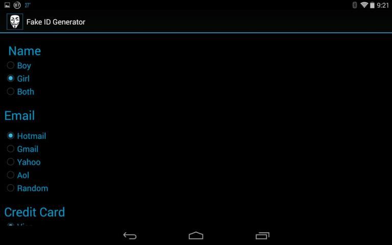 Чтобы помочь вам даже больше на поиске истинного случайного ID, который соответствует вашему вкусу вы можете указать определенные критерии для каждого раздела. Например, для раздела имя вы можете выбрать, что это будет либо мальчик, девушка или случайное имя и для раздела кредитной карты вы можете кредитной карточки компании или оставить его случайным.