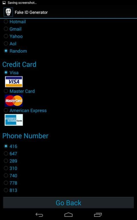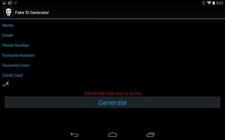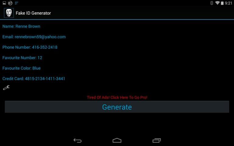 Вы можете использовать Поддельные идентификаций, созданные в этом приложении, чтобы заполнить обследований просят частной информации, как ваше имя, адрес электронной почты, номер телефона и т.д., или использовать его, чтобы подписаться на онлайн-услуг анонимно, таких как Netflix, YouTube, Google, facebook, Twitter , Tumblr и т.д. При использовании большой базы данных Это приложение имен вы в состоянии создать поддельное удостоверение личности, не опасаясь повторения или отсутствия случайности.