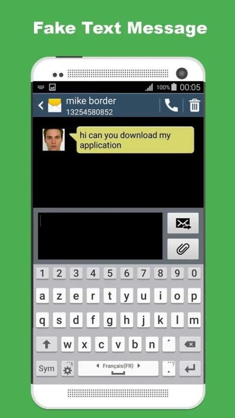 вы можете отправить поддельные смс или поддельные текстовые сообщения на себе, или может сделать поддельные SMS / текстовые сообщения от другого человека. самый профессиональный текст сообщения подделка и смс / текст приложения на рынке! выйти неприятности, дайте себе поддельный текстовое сообщение или SMS (текстовые сообщения)! это приложение имитировать поддельные текстовые сообщения, чтобы спасти вас от неловкой ситуации поддельный текстовое сообщение SMS совершенно бесплатно. хотите, чтобы ваши друзья думают, что вы получаете важную смс, и вы по-прежнему предпочитают их на знаменитостей, как президент или любые другие знаменитости? поддельные смс поможет вам выбрать контакт из списка контактов или ввести новый контакт. можно также выбрать время для приема SMS и настроить несколько поддельные смс на разные моменты времени.