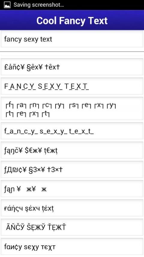 Fancy Text enable you to create cool ,funky names,letters and text. to use fancy text you first need to enter your original text in the first text field.As you enter your original text in this field the field automatically show the different different stylish font. you can choose any stylish font. using fancy text you can impress your friend. These fancy Text can be use with Facebook,Whats App, SMS ,messages on Yahoo Messenger! Google talk and also on BBM. These fancy Text can be use with another third party Application. Fancy text gives you 28 fancy text styles to choose.
