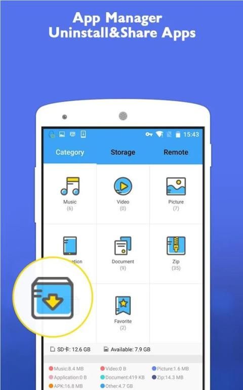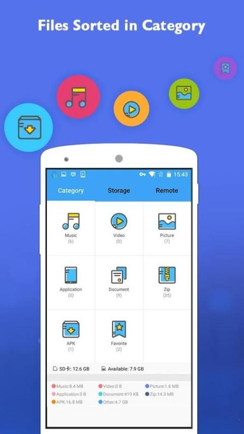 Файловый менеджер обеспечивает быстрый доступ к определенному файлу, он использует виджет для доступа к папкам в одном кране с главного экрана, таких как музыка, видео, изображения, приложения, застежка-молния, и APK. Она также позволяет просматривать и получать доступ к файлам по категориям.