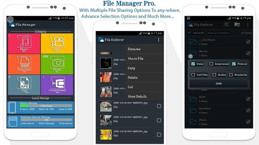 File Manager Pro. Помогает вам управлять все файлы легко с новым Проводником Windows Style.It позволяет обрабатывать файлы и папки Any-где из хранилища устройств и Micro-SD Card Storage.External USB также поддерживается Вы можете исследовать, копировать, перемещать или Удаление данных путем подключения USB Flash Drive To Mobile от OVG Cable.File Manager Pro. очень легко использовать бесплатный файловый менеджер и является бесплатным File Explorer с партией Features.It Предоставляет вам хороший вид по категориям для всех файлов Так вы можете изучить легко и Fast.It также предоставить Вам Advance Параметры выбора с помощью которого можно выбрать файлы легко и правильно в очень быстрые Way.It позволяет копировать, переименовать, удалить, Find, делиться ими и просматривать файлы в очень эффективный Way.It очень Smart File Explorer, с помощью которого вы можете исследовать любой тип медиа-файла Как Video, аудио, фото Вы можете изучить документы, сжатые файлы, почтовый индекс и Рар Files.You можете поделиться легко на Доля социальных медиа Bluetooth или с друзьями Just In One Click.It Ручки Ваши Папки эффективно Вы можете добавить новую папку в Storage.It очень легкий и смекалка File Explorer С помощью простого и интересных функций это увеличить файл Вашего мобильного Изучение Speed.You Может Проводник Легко Ваши Подключенные Смарт Устройства хранения и можно проверить их в наличии и используются Storage.Experience и наслаждаться полезными функциями File Manager Pro. для Free.and Управление файлами Эффективно.