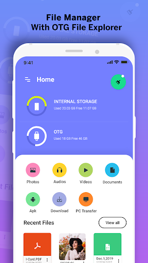 File Manager with OTG File Explorer app maintains a Recent Files section that displays recently used or views files. File Manager with OTG File Explorer app provides articulate editing options for images, videos, audios, documents, etc.