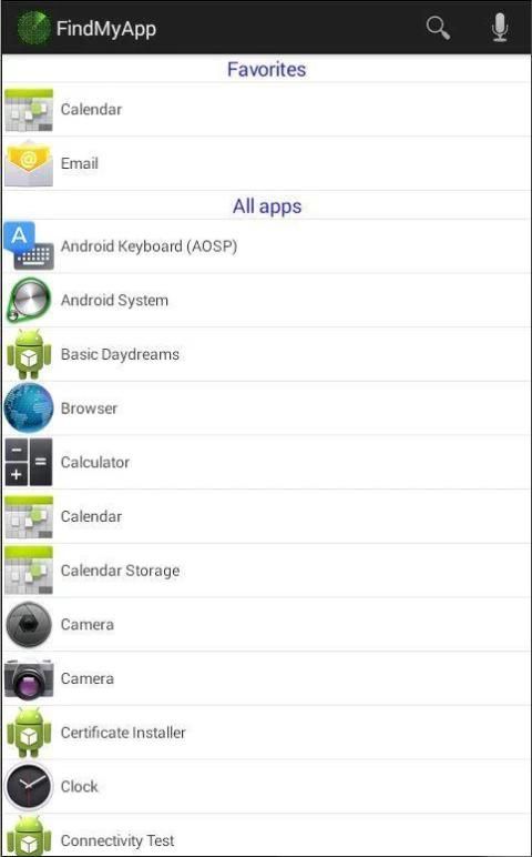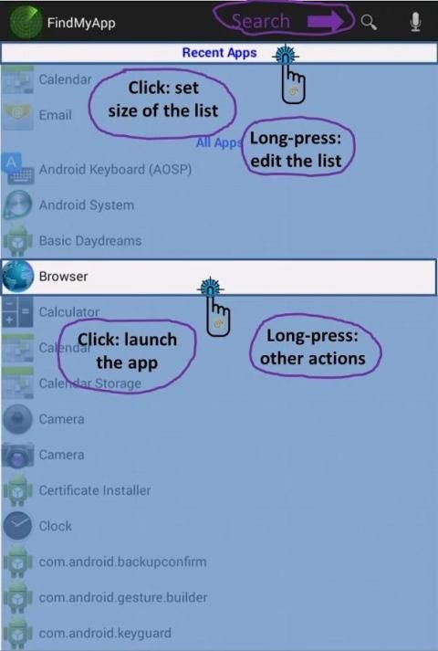 FindMyApp является простой, но полезный инструмент, чтобы помочь вам быстро найти приложения, которые уже были установлены на вашем телефоне или планшете. Он выполняет очень похоже на кнопку запуска в Windows 7. Вы можете найти, введя ключевое слово, или поиск по попросту говоря. Приложение поддерживает неоднозначное соответствие таким образом, вы можете просто ввести в систему или сказать любую часть имени приложения. Или, вы можете просто искать приложения в алфавитном порядке.