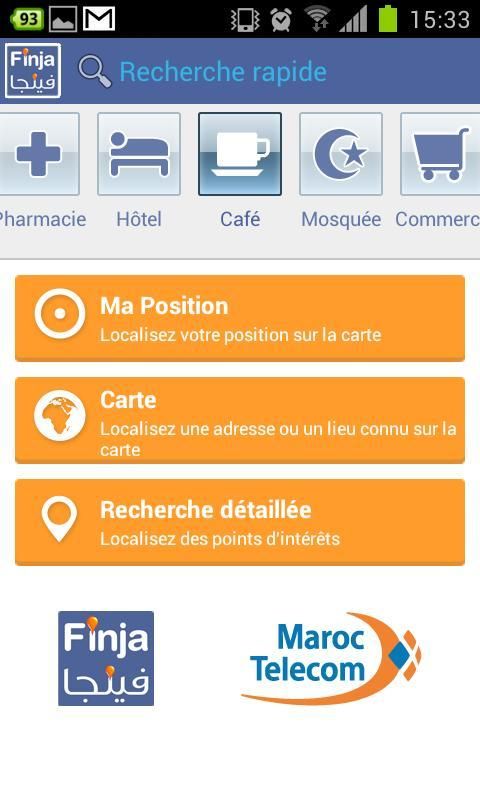 Finja является картографический сервис и поиск ближайшего привлекательность. Если у вас есть 3G или просто mobilezone подписку Марокко Телеком Интернет, вы можете указать свое местоположение и поиска мест и точек ближайшего вас интерес с легкостью.