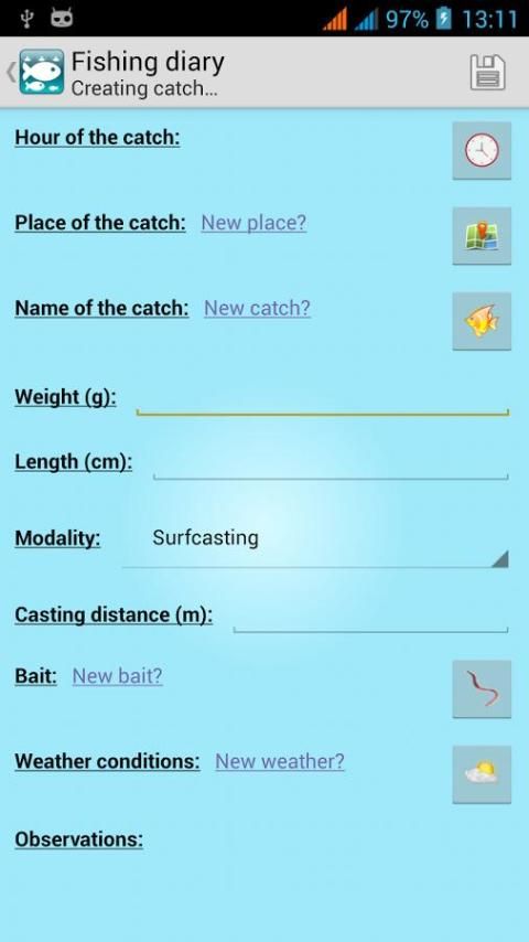 Рыбалка дневник не просто дневник, из записанных данных может сказать вам, что сайты дают больше уловов или лучшие куски. Кроме того, для каждого рыболовном районе, вы будете знать, какие условия были более благоприятными.