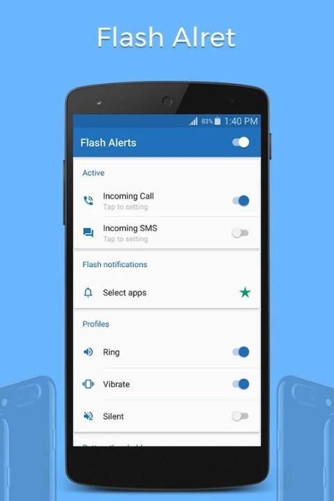 ✔ Установить Flash оповещения по вызову и SMS для оповещения, когда мобильный телефон находится в вибрировать или Бесшумный.