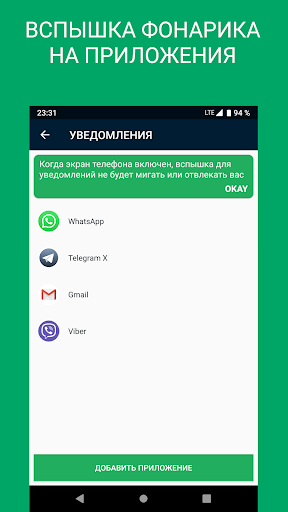 - Flash на уведомления от Viber, Facebook, Messenger, Instagram, Skype и Whatsapp