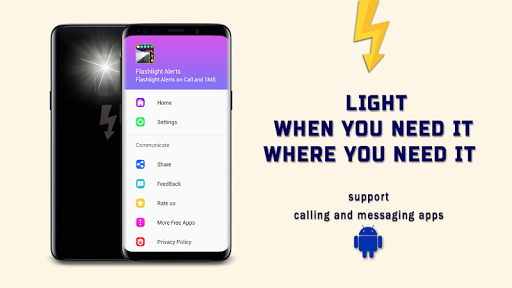 Ultimate bright flash on call and SMS notify you clearly by Camera flash alerts with LED blinks change your flashlight with Flash On Call gives flash alerts on incoming Calls and SMS tactical Flash alert flashlight. You can regulate blinking frequency for your LED flash alerts flashlight per application with Flash alert launcher tactical flashlight ringing flashlight on call and SMS / Notifications.