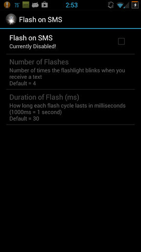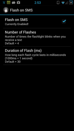 Flashes phone's flashlight when you receive a text It's like the iPhone alert; hopefully I don't get sued by Apple.Free and ad-free.Can turn on/off, set duration of the flash number of times it blinks, and whether or not to only flash when screen is off.Very small, simple, lightweight.