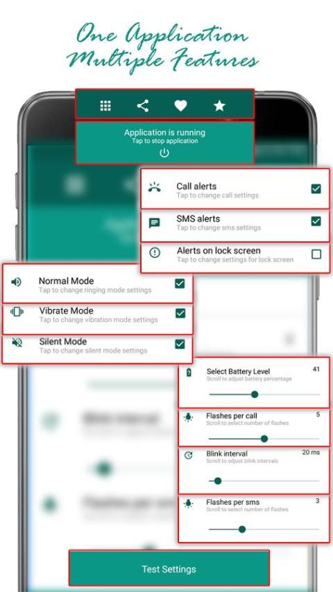 ★ Кнопка Настройки тестирования в приложении будет проверять текущие настройки приложения предупреждений вспышки.
