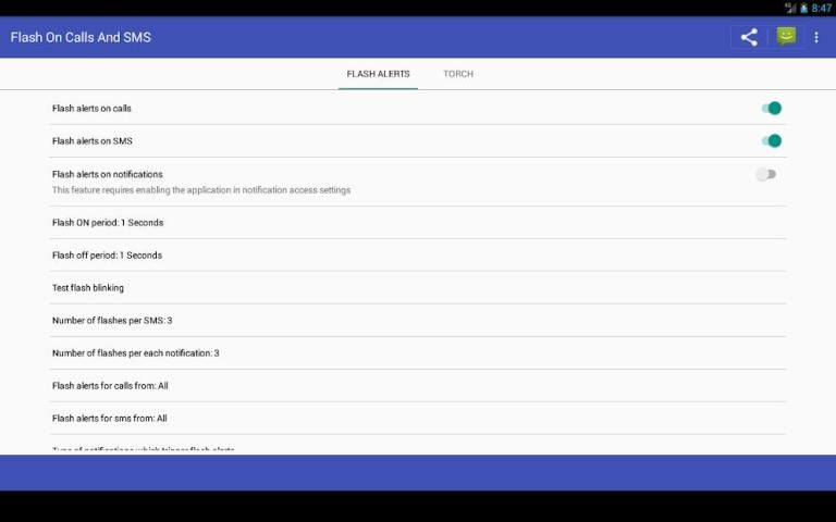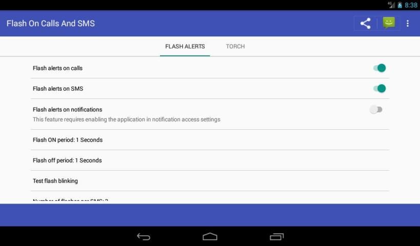 Flash on call and SMS will use your camera flash to make flash alerts when you receive a call, text message and notifications. you can also use the application as a torchlight.