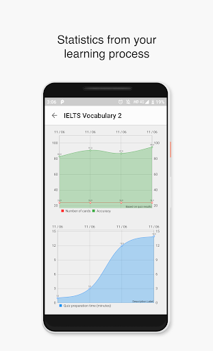 Режим викторины позволяет вам пройти тест из ваших карточек. Количество истинных ответов на ваши карточки отслеживаются для каждой набора FlashCard, и дает вам статистику эффективно организовать ваше время обучения. Результаты сохраняются в качестве статистики, чтобы вы следили за своим ежедневным прогрессом.