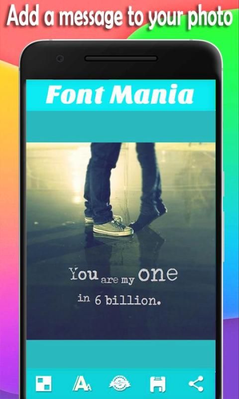 редактирование изображений и надпись на фото никогда не было проще! С Ввод текста на изображениях вы можете экспериментировать с большим разнообразием симпатичных шрифтов, или добавить текст наклейку, затенение, заполняющая, настроить прозрачность и добавить фон бесплатно! Если вы уже сделали ваши любимые изображения коллажа, применять фотографические эффекты и фильтры и добавлены кадры изображения, следующая вещь, чтобы сделать, это загрузить это приложение Fontmania и добавить искру вашего личного контакта с вашими снимками камеры! Расширьте свои роскошные фотографии с некоторыми прохладными цитатами и сообщениями и получать удовольствие, используя это милое приложение Photo Booth. Повышать любовь пару фотографий и забавных изображений с помощью этого это!