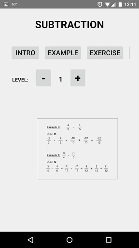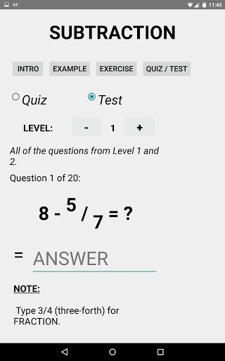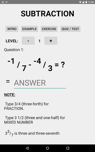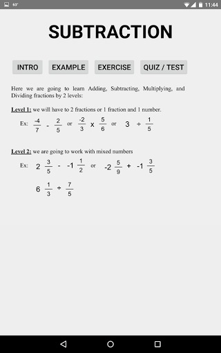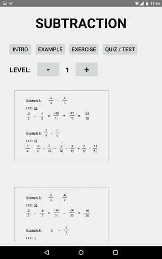Fraction Math Two is designed to teach student how to basic math problem with positive and negative fractions. It contains several topics: addition, subtraction, multiplication, division. Each of them has 5 subtopics. The first one is the introduction which gives you a overall of what you are going to learn in the topic. And then, base on a specific level, you would have 2 to 4 examples. Next you will have a chance to practice by doing the exercises. When you have mastered with it, you can check your knowledge with the quiz. After completing all of the levels you may do the test to see how well you understand the topic and if there are some missing part that need to be reviewed. As mention earlier that examples, exercises, and quiz are divided into levels. There are 2 levels in one topic. The first one would be really basic. It helps student easily get into topic. When they move to the next level, they will have to apply what they have learned in the previous one to solve the problem. When you get to the final level, you will see all of the hard problems, but it’s still possible to solve.