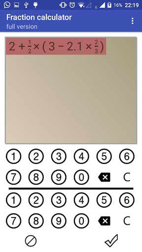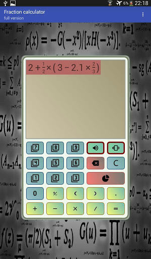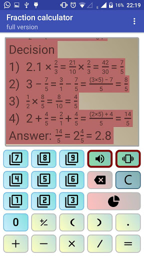 Представляем вашему вниманию калькулятор для дробей! Очень полезное и удобное приложение для решения повседневных задач. Калькулятор для дробей производит сложение, вычитание, умножение и деление обыкновенных дробей, смешанных дробей и целых чисел. Имеет звуковое сопровождение и виброотклик. Ход решения разбит на отдельные действия и отображается в процессе вычисления примера. С этой программой проверка домашних заданий по математике станет для Вас увлекательным занятием!