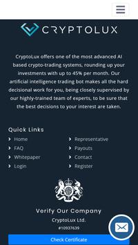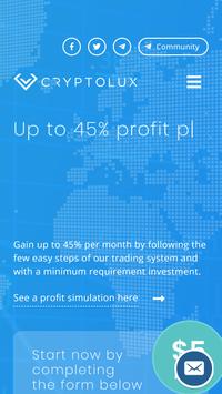CryptoLux offers one of the most advanced AI based crypto-trading systems, rounding up your investments with up to 45% per month. Our artificial intelligence trading bot makes all the hard decisional work for you, being closely supervised by our highly-trained team of experts, to be sure that the best decisions to your interest are taken.