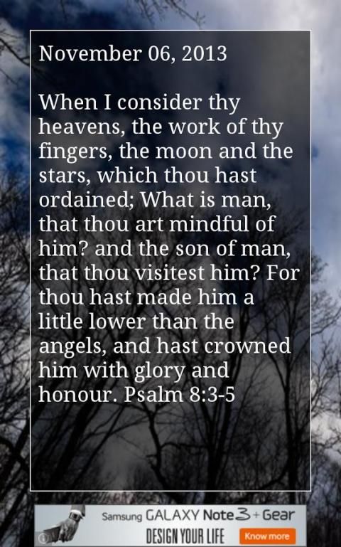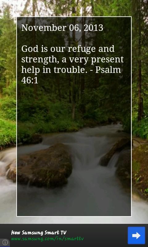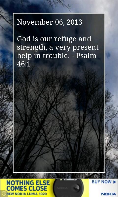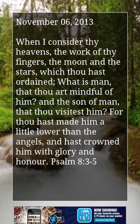 Это приложение обеспечивает один ежедневный стих из Библии на свой телефон каждый день. Просто откройте телефон каждый день и увидеть стих в течение дня. Это поможет вам сохранить мотивацию и положительное каждый день.