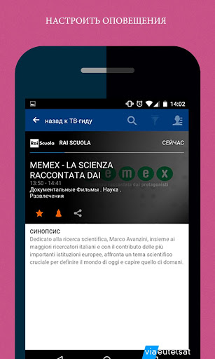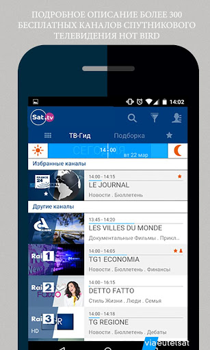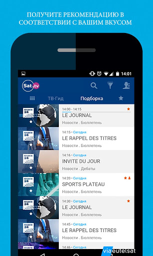 Sat.tv — это путеводитель по телепередачам бесплатных каналов спутникового телевидения HOTBIRD С его помощью пользователи в любой момент могут ознакомиться с программами, транслируемыми по спутниковому телевидению, выбрать любимые каналы и передачи, получить индивидуальные рекомендации и уведомления, позволяющие не пропустить ни одной интересной передачи