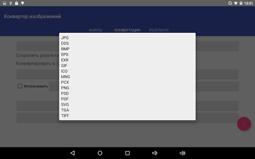 • Выберите формат: BMP, DDS, EPS, EXR, GIF, ICO, JPG, MNG, PCX, PNG, PSD, PDF, SVG, TGA, TIFF, VTF (некоторые форматы поддерживают настройки - используйте их для получения лучшего результата).