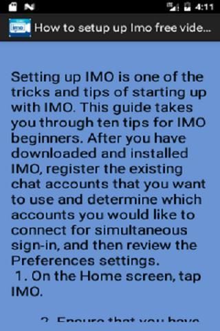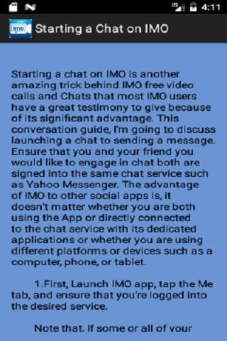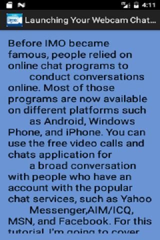 Это приложение содержание руководства для IMO бесплатных видеозвонков и чата. Это приложение позволяет вам знать, как не общаться с семьей и друзьями бесплатно, независимо от того, как расстояние, которое они являются IMO applicaiton. Из-за IMO, вы можете сделать видео или аудио звонки, отправлять изображения, отправить наклейки анимировать и отправлять текстовые сообщения, не беспокоясь
