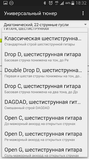 В память тюнера занесены более 90 видов строев для перечисленных инструментов, включая, но не ограничиваясь: