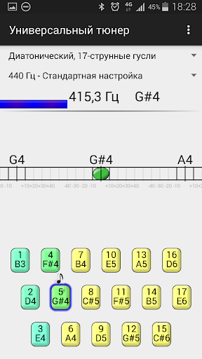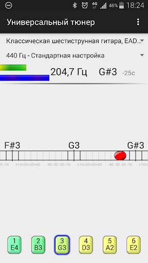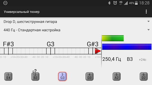 - Автоматический (по умолчанию) - тюнер сам попытается определить, какая струна настраивается в настоящий момент, отмечая цветом уже настроенные струны.