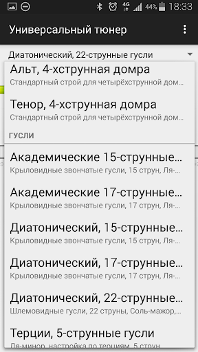 - Хроматический - отображает клавиатуру пианино, и позволяет настраивать инструмент на любую ноту.