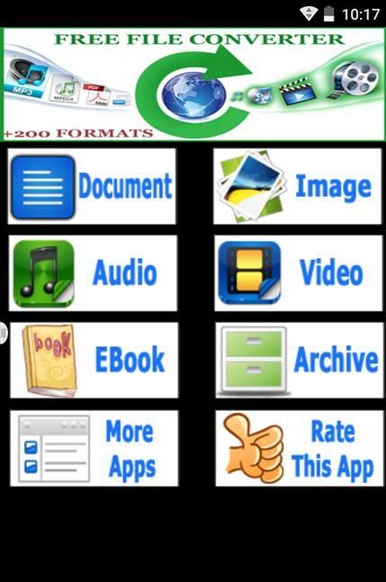 позволяют может конвертировать практически любой (тип файла) включают в себя: видео (MP4, WMV, AVI, WebM, ....), Аудио (MP3, M4A, WAV, WMA, FLAC, ....), документы (Doc, Docx, PDF, PPT, XLS, ...), изображения (PNG, JPG, ГПК, ICO, BMP, ...), книги (Моби, EPUB, Лит, AZW, PDF, ...) Архив файлов (RAR Страна, 7z, TAR, GZ, ...)
