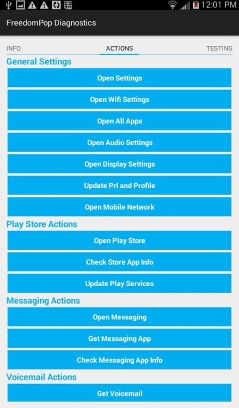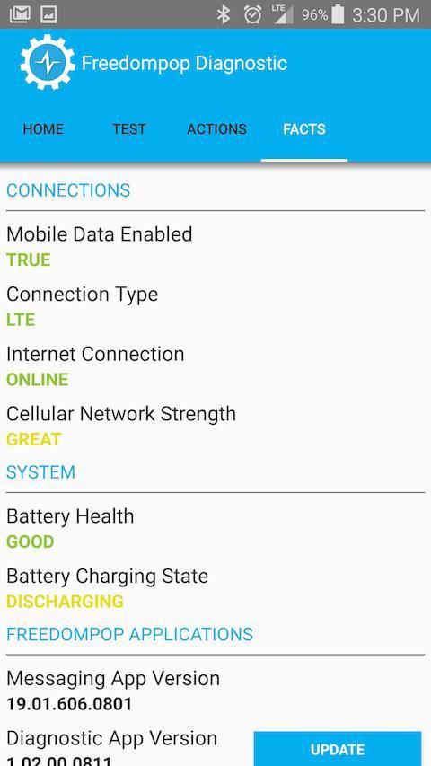 Диагностический App FreedomPop обеспечивает объединительную пользовательский интерфейс, который упрощает и ускоряет процесс сбора информации и тестирования функциональных возможностей FreedomPop устройству. Он создан, чтобы быть компаньоном при разрешении любых вопросов с нашей технической поддержкой во время вызова или по электронной почте.