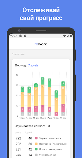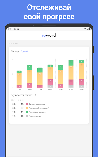 • Статистика обучения: отслеживайте запоминание слов за последнюю неделю, месяц, три месяца и год.