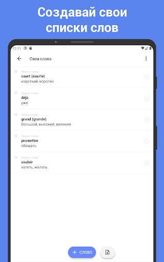 • Чтобы учить французские слова, всё что вам нужно делать, это только смахивать флеш карточки слов.