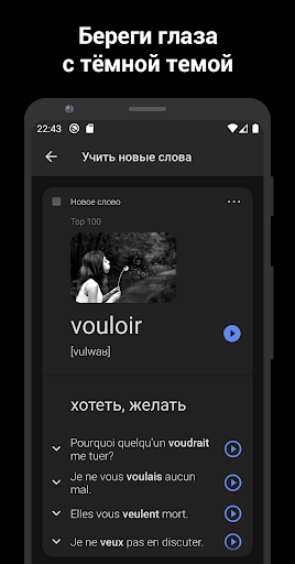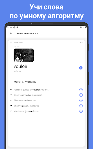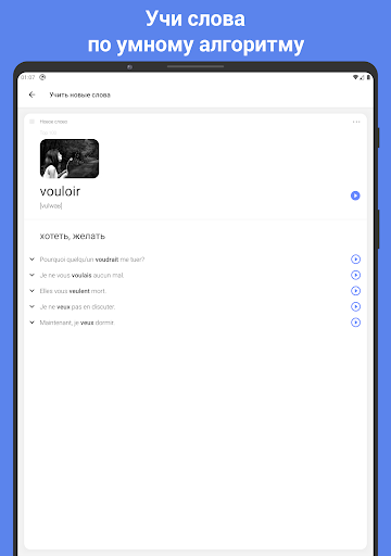 • Оффлайн режим работы позволяет учить французские слова где бы вы ни находились и превратить изучение французского языка в ежедневную процедуру.