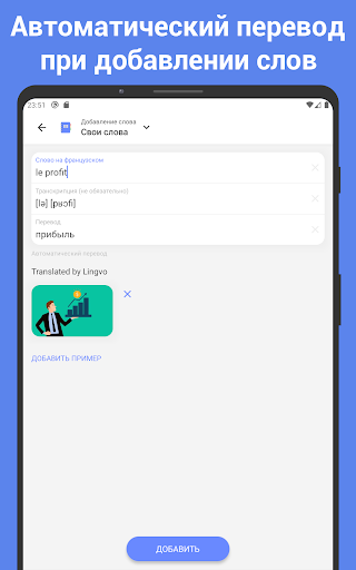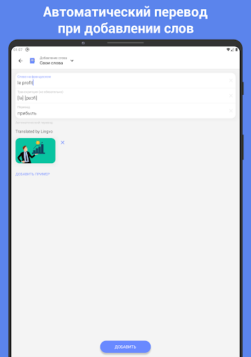 • Легко добавлять свои флеш карточки для запоминания слов: автоматически заполняются перевод, транскрипция, картинка и примеры.
