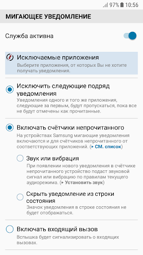 • мигающие уведомления для счётчиков непрочитанного от поддерживаемых приложений и соответственная кастомизацияиисключений приложений (