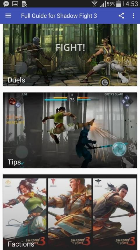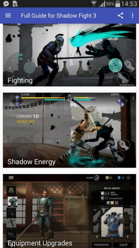 Это приложение создано для всех любителей Fight серии Shadow и вводит полное руководство для нового Shadow Fighter 3. Он включает в себя обзоры модернизации оборудования, новых боевые механики, различных фракции, советы для начинающих и многого других.