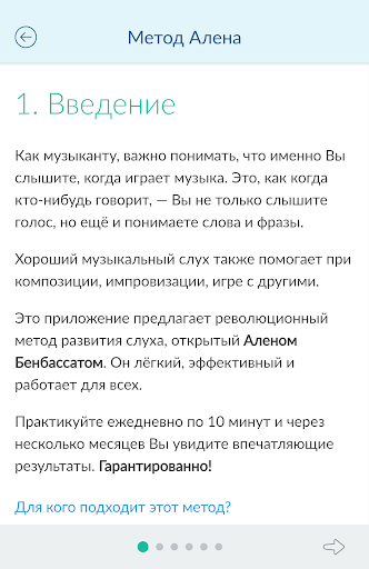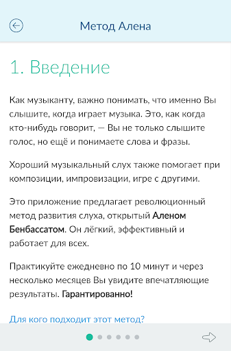 Я был так восхищен этой программой тренировки слуха, что разработал по методу Алена Бенбассата приложение на Android. Надеюсь, оно окажется полезным и для Вас.