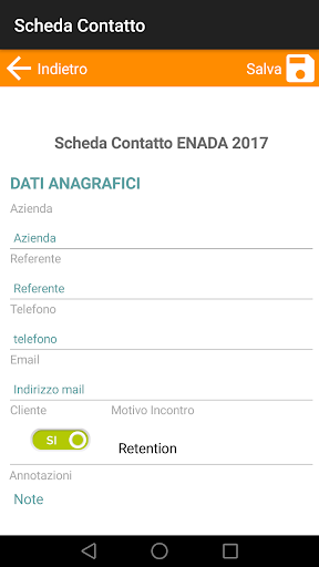 Questa app permette di registrare delle informazioni sui contatti commerciali con clienti in occasione di eventi o fiere di settore. I dati registrati sull'app vengono spediti ad un sito web per l'ulteriore analisi e gestione.