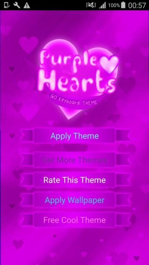 "GO клавиатуры Purple Hearts" является довольно тема предназначена для девушек, которые хотят принести цвет в их обычной клавиатуры на день Святого Валентина. Он имеет блестящие фиолетовые кнопки, установленные на фиолетовом обои, наполненной различными нюансами фиолетовый сердца и милые светящиеся белым шрифтом, чтобы соответствовать. Этот красивый и милый тема Внутренние Работы Студии подарок всем дамам, которые любят и как быть любимым.