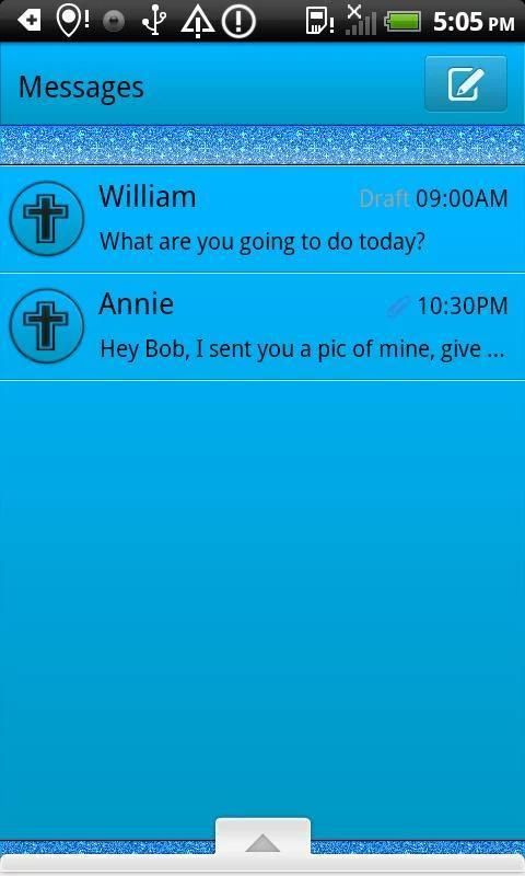 Это GO SMS Христианская тема, имеет белый крылатый конь в чате, фон голубой со звездами. Ящик для поп имеет крест на нем. Надеюсь, вам понравится.
