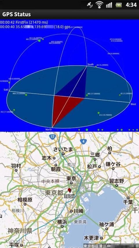 It shows GPS satellites positions and signal strengths on the hemispheric view.