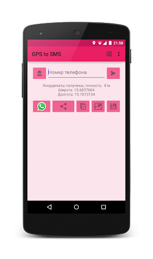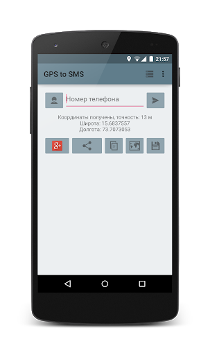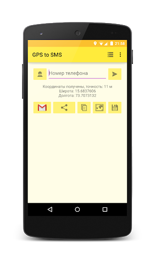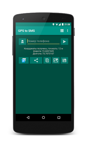 Простое приложение, которое позволяет определить Ваши GPS-координаты и послать их через SMS или поделиться ими с помощью стороннего приложения (почта, мессенджеры и т.д.).
