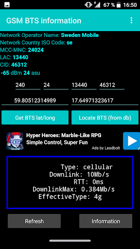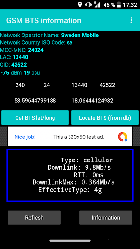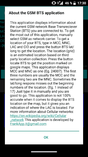 Это приложение отображает информацию о текущей сетевой базе GSM Transreciever (BTS), к которой вы подключены. Чтобы получить максимальную отдачу от этого приложения, вручную выберите GSM в качестве носителя сети. Чтобы получить местоположение вашей BTS, введите MCC, MNC, LAC и CID и нажмите кнопку BTS LAT / LONG, чтобы получить местоположение. Расположение (GRID) - это предполагаемое местоположение на основе коллекции местоположения третьего лица. Нажмите кнопку Найти BTS, чтобы получить положение, отмеченную на картах Google. Это приложение отображает MCC и MNC как один (например, 24007). Первые три числа обычно являются MCC, а остальные два являются MNC. Иногда лат / длинный ответ пропускает начало номера местоположения. (Например, 1 вместо 17). Просто введите его вручную, и вы хотите пойти. Это приложение не является точностью до 100%, когда речь идет о том, чтобы отобразить местоположение BTS на карте, но это дает вам указание на то, где находится LAC.