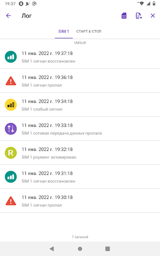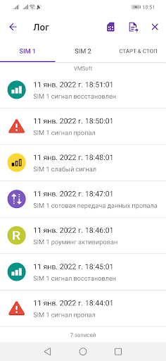 'Монитор сигнала GSM' записывает каждое событие, связанное с изменением сигнала в лог с уведомлениями. Он содержит информацию о том, когда сигнал исчез, восстановлен или слабый. Дополнительно записывается информация о потери мобильных данных. Можете сконфигурировать в настройках приложения что желаете чтобы записывалось в логах приложения. Лог с уведомлениями можно экспортировать в CSV, PDF и HTML форматах.