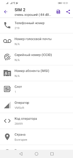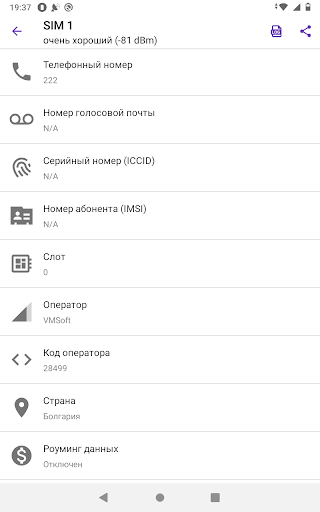 Приложение предоставляет информацию о SIM карте в устройстве, например: телефонный номер, номер голосовой почты, серийный номер SIM карты (ICCID), абонентный номер (IMSI), мобильный оператор и вид сети. Можно легко поделиться информацией о SIM картах с помощью бутона поделиться, или скопировать в буфер обмена.