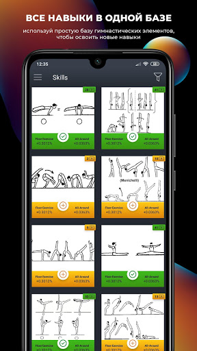 Каждый элемент представлен рисунком и описанием, которые объясняют его выполнение. Вы можете добавить свое собственное видео для каждого элемента и получить процент навыка на гимнастическом снаряде.