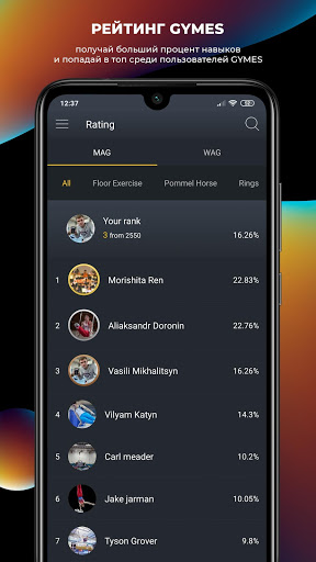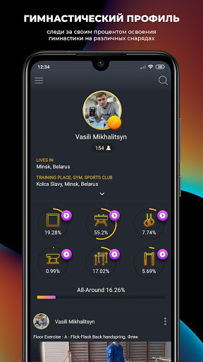 Смотрите диаграммы в своем профиле, которые показывают процент владения элементами на гимнастических снарядах. Чем больше вы загружаете видео, тем больше ваш процент. Вы можете узнать свой процент не только по каждому снаряду, но и по гимнастике в целом.