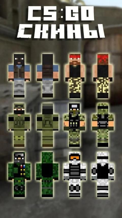 Конечно, мы не можем не рассказать про наши майнкрафт скины для мальчиков отдельно! Хотите скачать скины из игр для майнкрафт, чтобы стать персонажем культового fps? И сделать скин в майнкрафт выделяющимся? Прекрасно! У нас есть cs go скины в стиле майнкрафта — это отличные скины для парней! Узнаваемые персонажи для майнкрафт контров и их противников обязательно порадуют поклонников обоих игр! Устройте cs go в майнкрафте и покажите всем, что с ваши шутки плохи! Конечно среди всех режимов в майнкрафт мультиплеер — это лучший выбор для игры с такими скинами! А если установить вдобавок где-нибудь найти и установить майнкрафт мод на оружие, то вы сможете превратить мир майнкрафта в настоящее сражение с вашими друзьями! Эти и другие текстуры для майнкрафта отлично подойдут тем, у кого устройства поддерживают и HD-скины. Посмотрите в 3d скины на майнкрафт из нашего приложения, и скачайте понравившийся из нашей коллекции!
