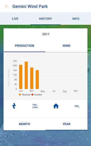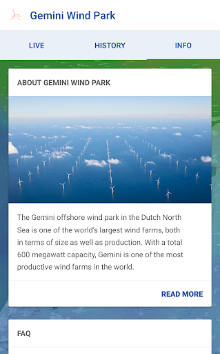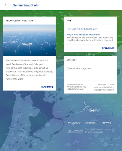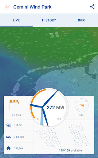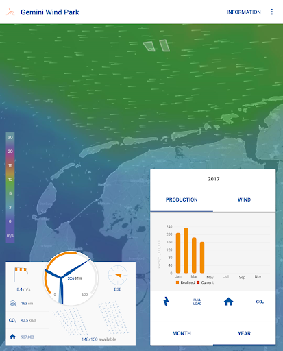 The Gemini Wind Park application allows you to view live production data and meteorological information of one of the world’s largest wind farms, located in the Dutch North Sea. Discover the actual and historical wind conditions and energy production of Gemini Wind Park and find information and frequently asked questions.